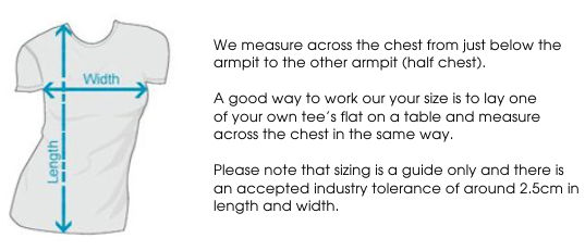FIT: Relaxed fit - please check the size chart to avoid disappointment. Lay your own tee flat on a table, measure armpit to armpit across the chest and match to the size you feel is best. Please note measurements can vary within 2.5cm, this is within the accepted tolerance.